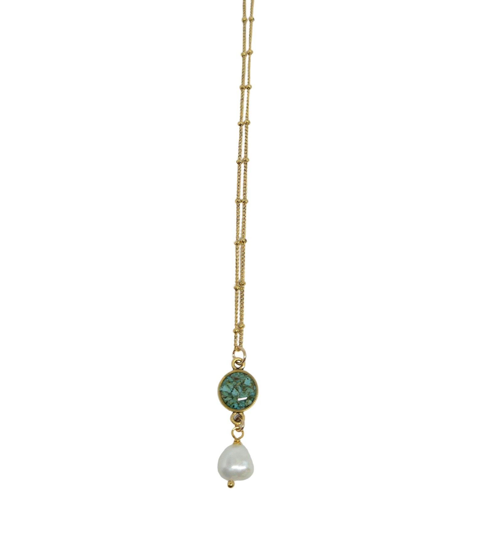 Regular price $60.00 Save $-60.00This dainty piece manages to get attention. The centerpiece has a tiny link from a 1950's necklace. The original necklace was created with all these beautiful small ornate circles with a pearl center. The necklace only measured 15" and some to of the links were not pristine. The necklace was taken apart so each little circle could shine on its own. The small circle pendant is pewter with 24K gold plating and it dangles from an 18" gold plated chain.